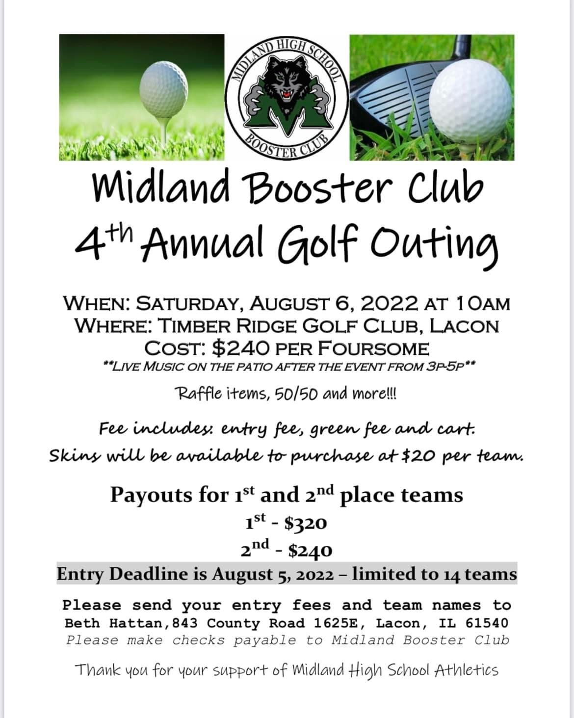 🐺 Midland Booster Club 4th Annual Golf Outing Saturday, August 6, 2022 10:00 AM 4:30 PM Timber Ridge Golf Club 1400 Illinois 17 Lacon, IL, 61540 United States (map) Google Calendar ICS
