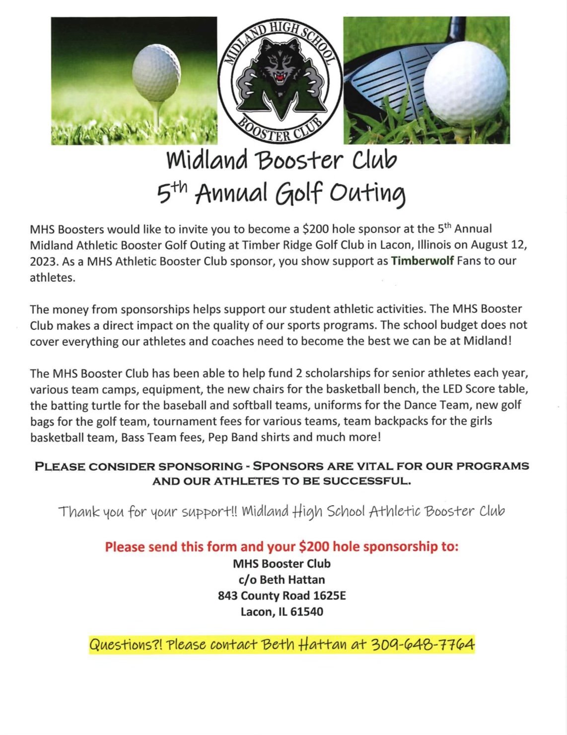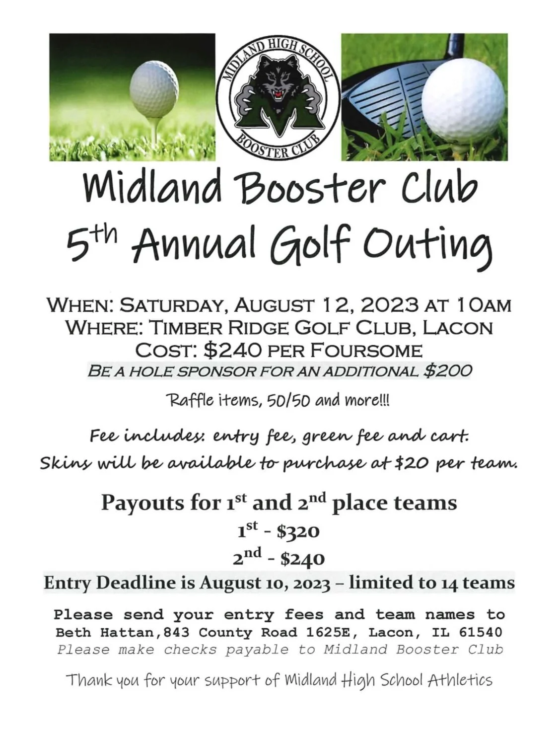 ๐๏ธโโ๏ธSwing into action at the Midland Booster Club's 5th Annual Golf Outing on Saturday, August 12th! ๐๏ธโโ๏ธWhether you are a serious golfer or just there to have fun and raise funds for athletics at Midland, it is sure to be a great day!