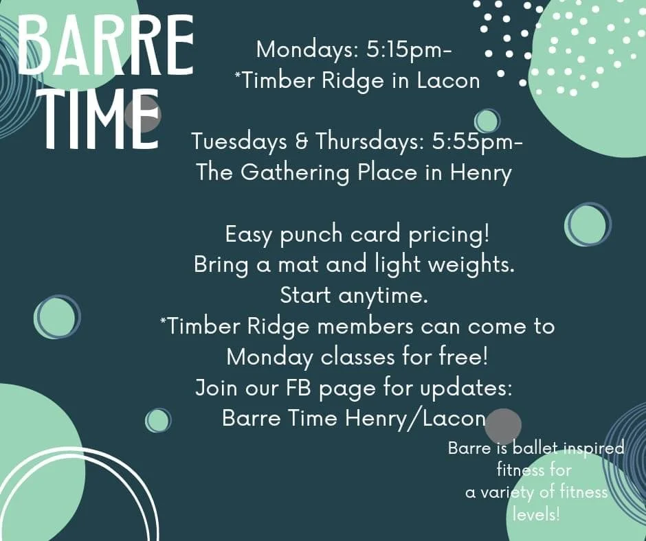 👟Barre Time Monday, October 10, 2022 5:15 PM 6:15 PM Timber Ridge Golf Club 1400 Illinois 17 Lacon, IL, 61540 United States (map) Google Calendar ICS Start Barre classes anytime! Low-Impact workout with results you'll notice! 5, 10, and 20 class punch cards available. No punch card has you paying more than $10 per class.Every Monday at 5:15 PM - Open to Public -Free to TRGC Members!