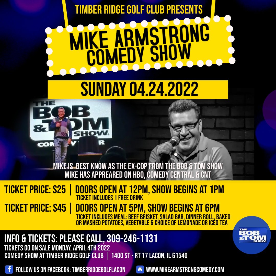 π Mike Armstrong is best known as the Ex-Cop on The Bob & Tom Show. Armstrong has also appeared on HBO, Comedy Central, Fox and CNT as well as opening for major musical acts such as Michael Buble, Alan Jackson, Tracy Lawrence and David Allan Coe (just to name a few.)
